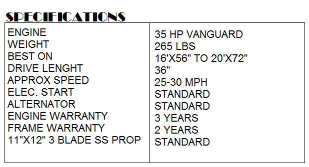 What a powerhouse this beast of an air cooled engine is! Briggs did their homework on this baby. Featuring 35 horsepower of kick butt surface drive action, this baby takes on the load and asks for more. Perfect for medium to heavy loads and conditions with 2 or more people, gear, dog, etc. If you want to see the true beauty of Surface Drive performance, look no further!